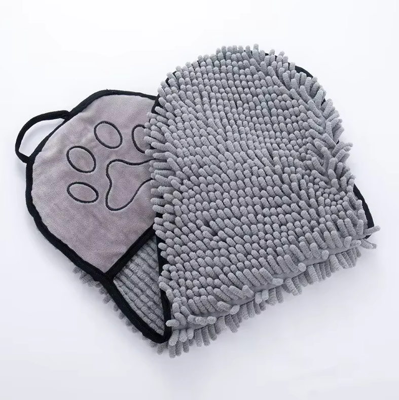 This pet towel is perfect for drying my dog after a bath. The glove feature is great for reaching his paws and drying him faster.