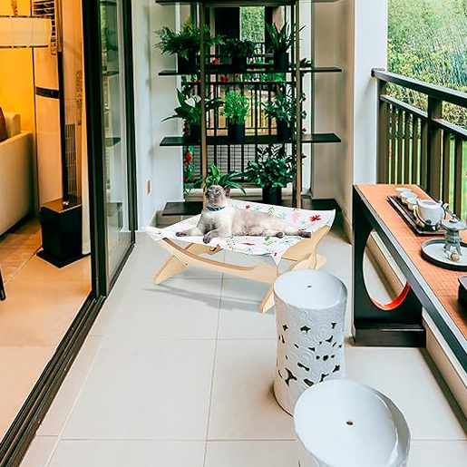 "The colourful cat chaise lounge catches everyone's eye and provides my cat with a super comfortable place to relax. The sturdy wooden frame ensures its stability, and my cat can unwind on it anytime."